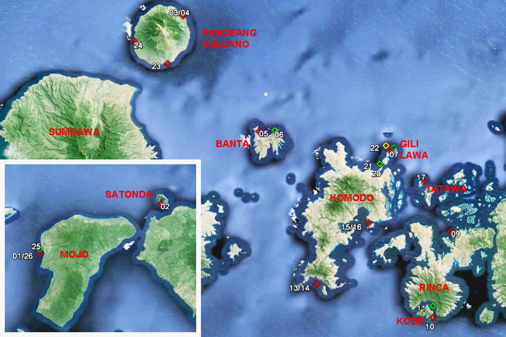 Les plongées Parti de Sanur, le Mermaid I nous a emmené jusqu'au parc de Komodo, à 500 km environ à l'est de Bali. Nous nous sommes arrêtés sur plusieurs sites de plongée en cours de route et avons fait 3 excursions pédestres sur les iles Satonda, Gili Lawa Laut et sur Rinca. Toutes les plongées de la croisière.