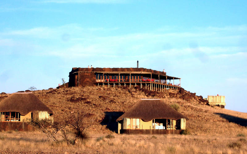 | Le lodge de Doro Nawas: sur le toit, à droite, un responsable guette notre retour |