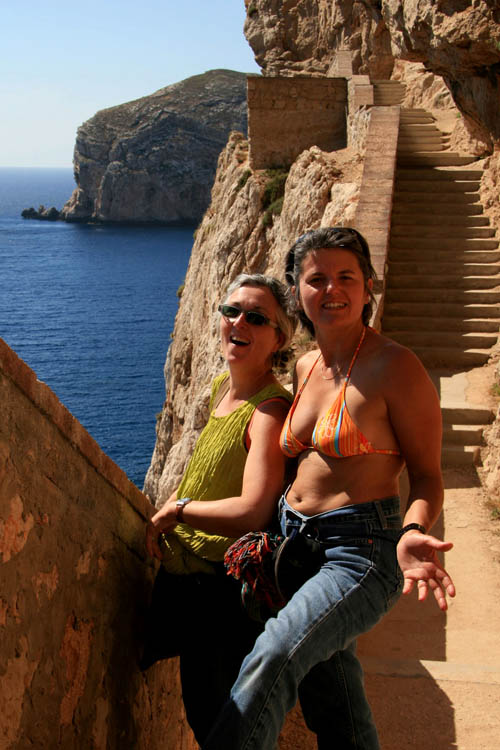 jeudi 10 juillet : après un footing matinal pour les plus courageux et un petit-déj banal, départ pour Alghero via Cuglieri et Bosa sur les 2 motos restantes. Repas quelconque à Alghero dans un resto face à la mer qui a tout l'air d'être le QG de la mafia locale. Baignade délicieuse vers Torre del Porticciolo et départ vers 16h15 pour le Grotta di Nettuno. 649 marches à descendre la falaise; c'est splendide! Visite en groupe de la grotte qui, elle aussi est magnifique. Retour au gite par la route du bord de mer dans le coucher de soleil entre Alghero et Bosa (là les mots me manquent pour exprimer notre bonheur!) |