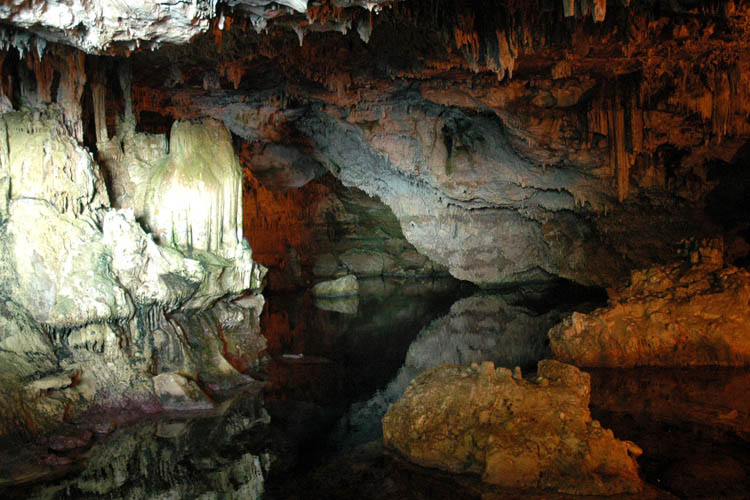 | Fantasmagories lumineuses sur les stalagtites de la grotte |